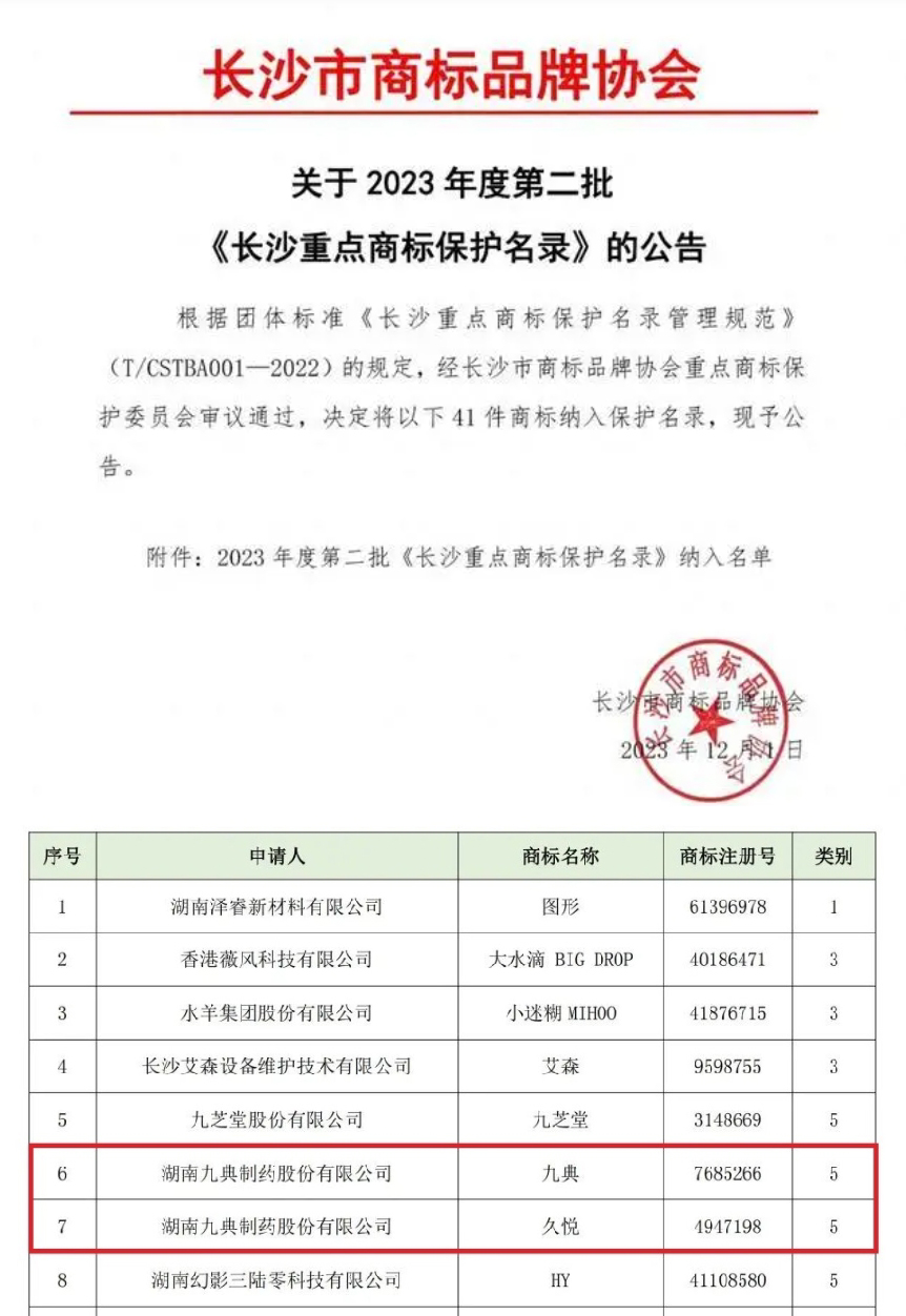 長(zhǎng)沙市商標(biāo)品牌協(xié)會(huì)近日發(fā)布《關(guān)于2023年度第二批長(zhǎng)沙重點(diǎn)商標(biāo)保護(hù)名錄的公告》,公布了第二批納入《長(zhǎng)沙重點(diǎn)商標(biāo)保護(hù)名錄》的41件重點(diǎn)商標(biāo)。九典制藥“九典” “久悅”兩件商標(biāo)上榜。